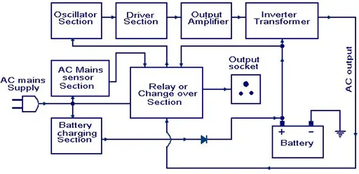 خروجی AC: جریان متناوب نهایی با ولتاژ و فرکانس مورد نظر (مانند 220 ولت AC) به بار (load) مانند لامپ یا موتور تحویل داده میشود. مدارهای حفاظتی نیز برای جلوگیری از اضافهبار یا اتصال کوتاه تعبیه شدهاند.