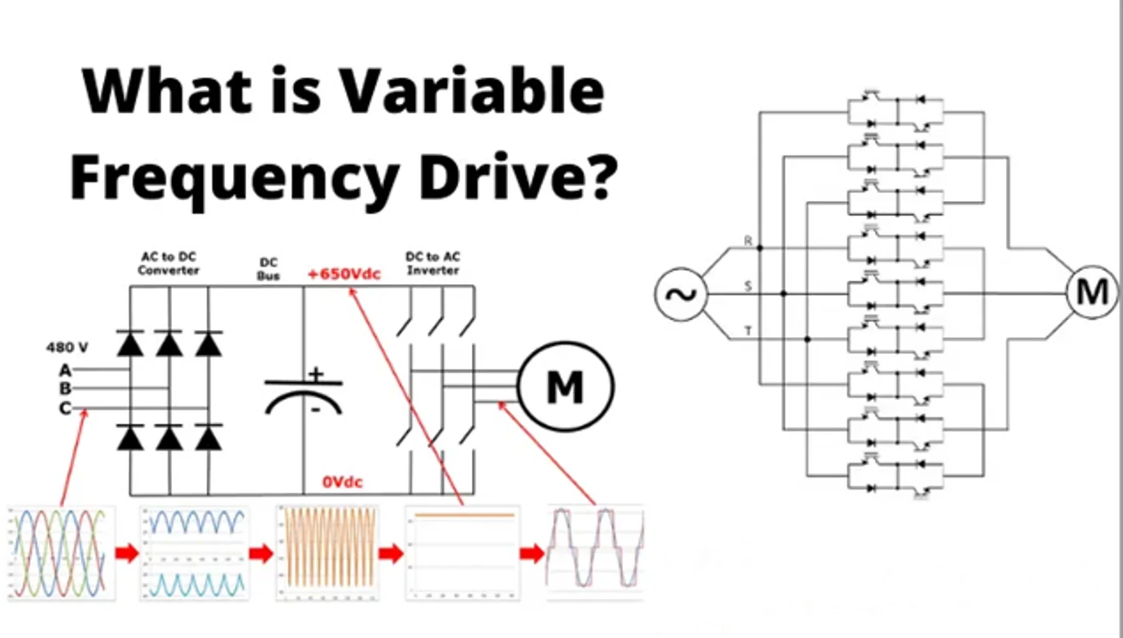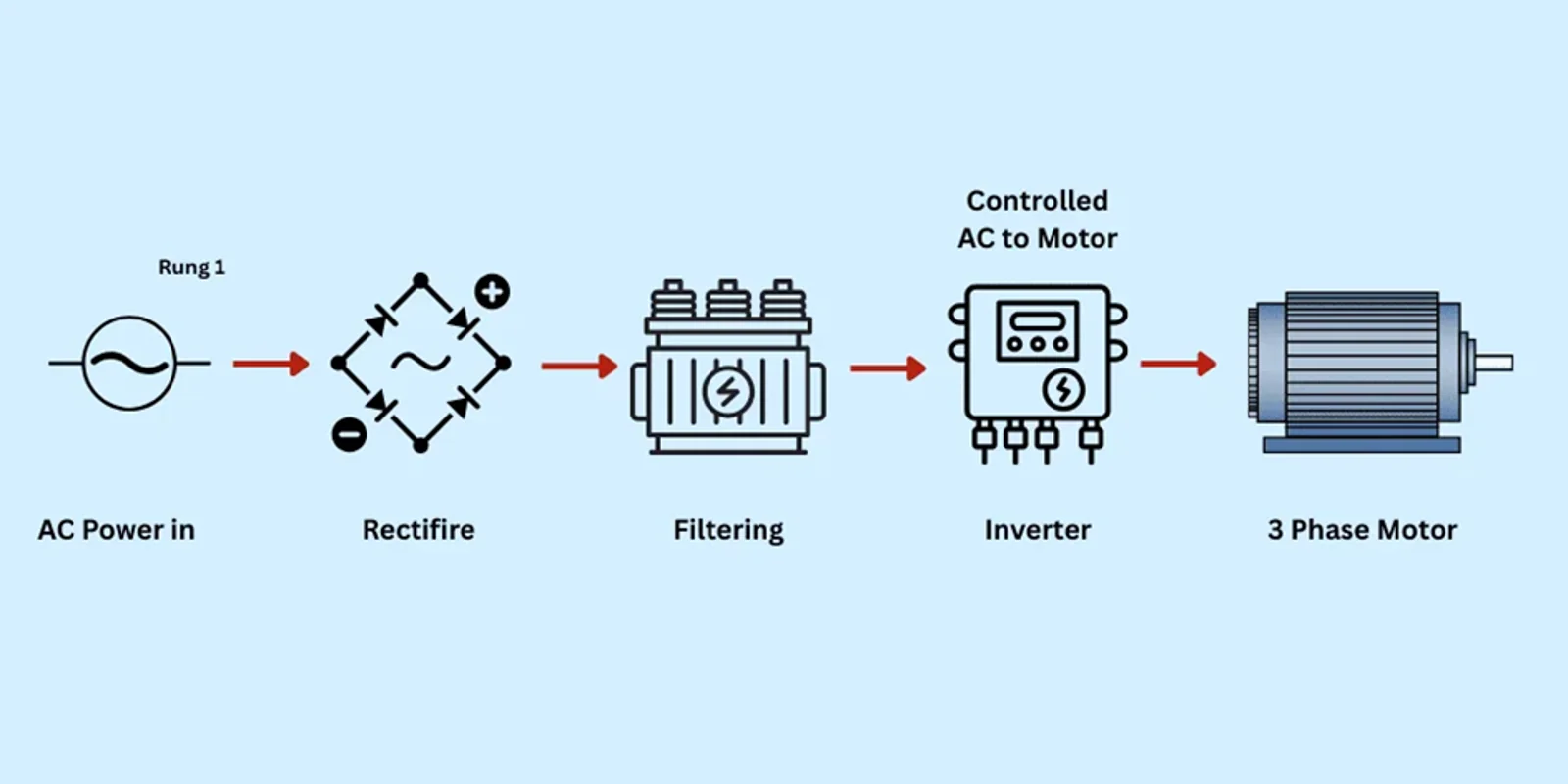 اینورتر درایو ابتدا برق AC ورودی را به DC تبدیل میکند، سپس با استفاده از مدارهای سوئیچینگ مانند IGBT، آن را دوباره به AC با فرکانس و ولتاژ متغیر تبدیل کرده و به موتور ارسال میکند.
