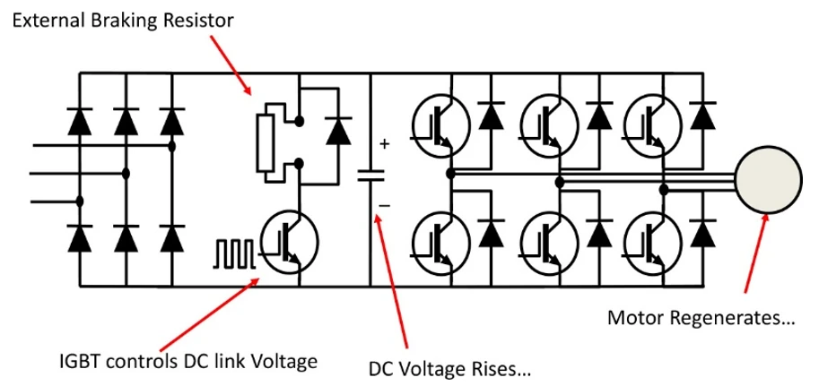 در حالت عادی، انرژی برگشتی موتور در خازنهای لینک DC ذخیره میشود. اگراین انرژی زیاد باشد (ترمز شدید یا اینرسی بالا)، ولتاژ باس DC از حد مجاز اینورتر بالاتر میرود. در این شرایط: