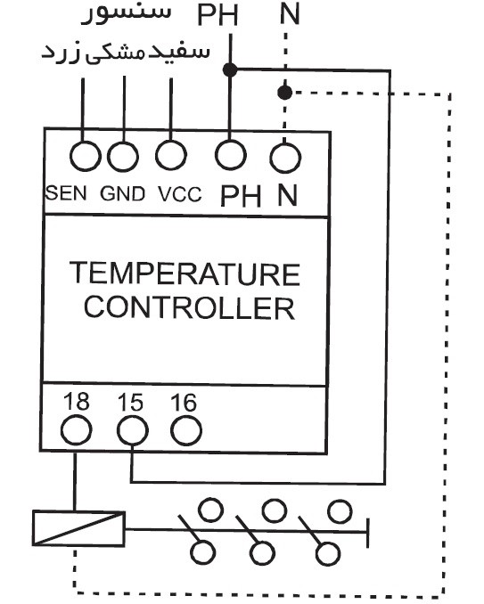 ابتدا مطابق نقشه، برق ورودی را به ترمینال های N و PH دستگاه وصل و سپس سیم های سنسور را با رعایت رنگ به دستگاه وصل نموده و مطابق راهنمای تنظیم، دستگاه را برنامه ریزی نمایید.