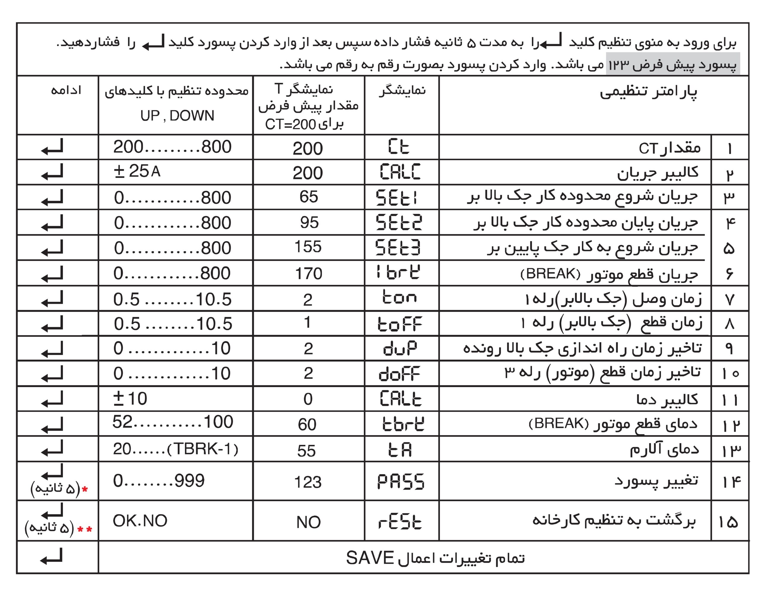 تاخیر زمان فعال شدن جک بالابر 0تا 10 ثانیه و زمان تاخیر قطع موتور 0 تا 10 ثانیه می باشد.