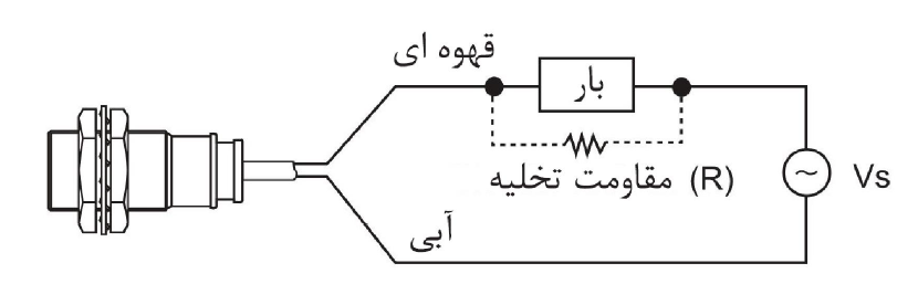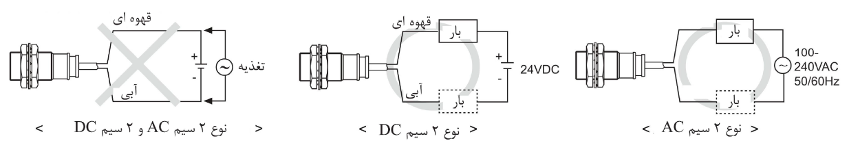 هنگام استفاده از سنسور مجاورتی دو سیم AC و DC، حتما بار باید وصل شود. در غیر این صورت قطعات داخلی سنسور ممکن است آسیب ببینند.(بار می تواند با هر جهتی متصل شود)