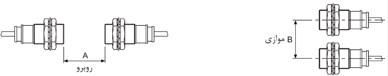 در صورتی که چندین سنسور مجاورتی به صورت نزدیک به هم متصل شده باشند، به دلیل تداخل مشترک در عملکرد سنسور ممکن است مشکلاتی به وجود بیاید. لذا، مطابق شکل زیر حداقل فواصل بین سنسور ها را رعایت کنید.