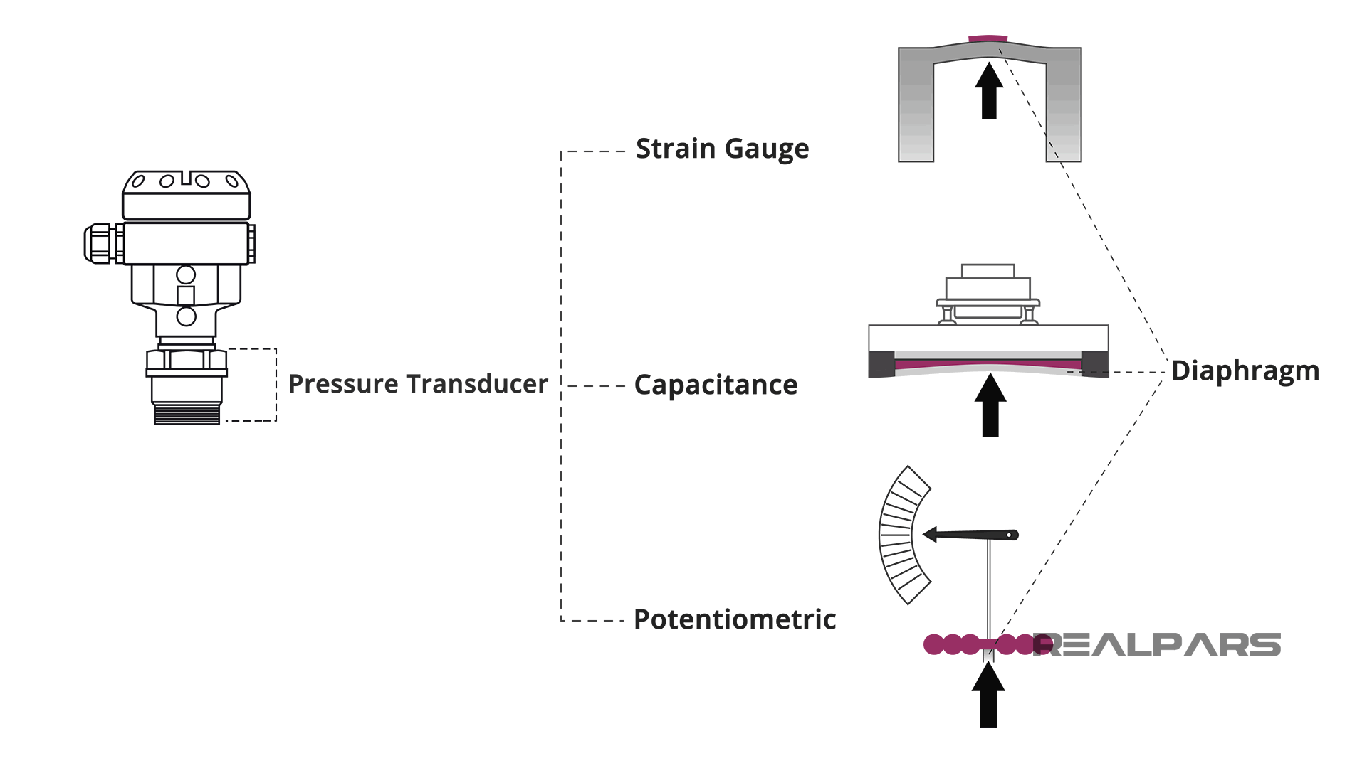 شامل مدارهای ساده مانند پل وتستون، مقاومت بار یا بایاس اولیه است و معمولاً حداقلی است؛ چون بخش اصلی پردازش در ترانسمیتر انجام میشود.مثلاً یک ترانسدیوسر فشار معمولاً شامل یک دیافراگم فلزی یا سیلیکونی با استرینگیجهای مجتمع است که در بدنهای قابل نصب روی لوله قرار میگیرد.