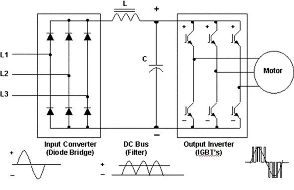 در سمت خروجی، درایو با استفاده از کلیدزنی IGBT و روش PWM یک ولتاژ شبهسینوسی تولید میکند. این ولتاژ از دید موتور تقریباً سینوسی است، ولی حاوی مؤلفههای فرکانس سوئیچینگ (چندکیلوهرتز) و هارمونیکهای فرعی است؛ این هارمونیکهای ولتاژ میتوانند باعث افزایش تلفات موتور، گرمشدن عایق و نویز الکترومغناطیسی شوند.