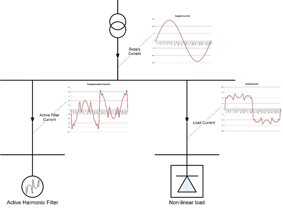 در پروژههای حساس، از فلیتر هارمونیک اکتیو استفاده میشود؛ تجهیزی که جریان هارمونیک را اندازهگیری و جریان جبرانی تزریق میکند تا شکل موج شبکه نزدیک به سینوسی شود.
