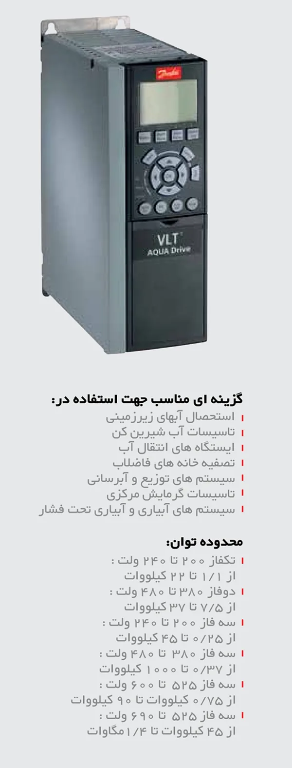 | VLT AQUA Drive FC 202 | 0-590 Hz | 1/1-1400 kW | پمپها و آب/فاضلاب |