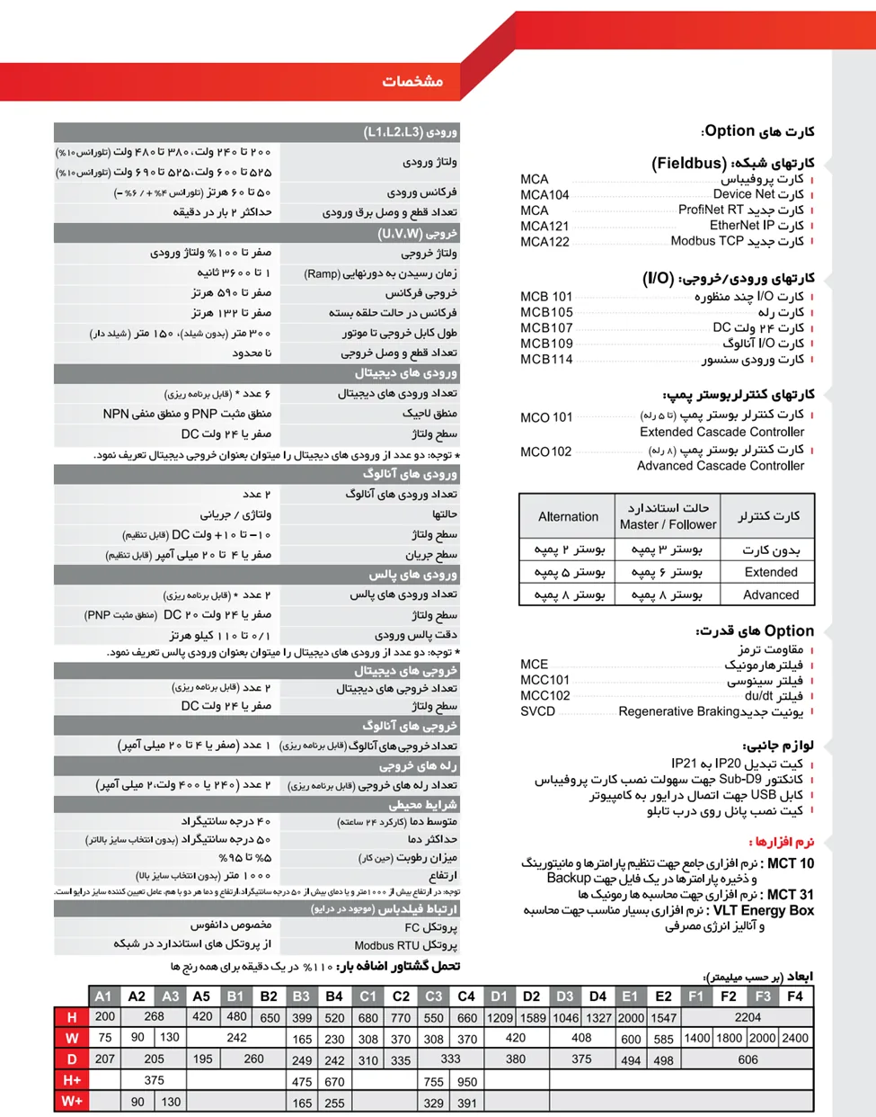 | VLT HVAC Basic Drive FC 101 | 0-400 Hz | 0/25-90 kW | تهویه مطبوع (HVAC) پایه |