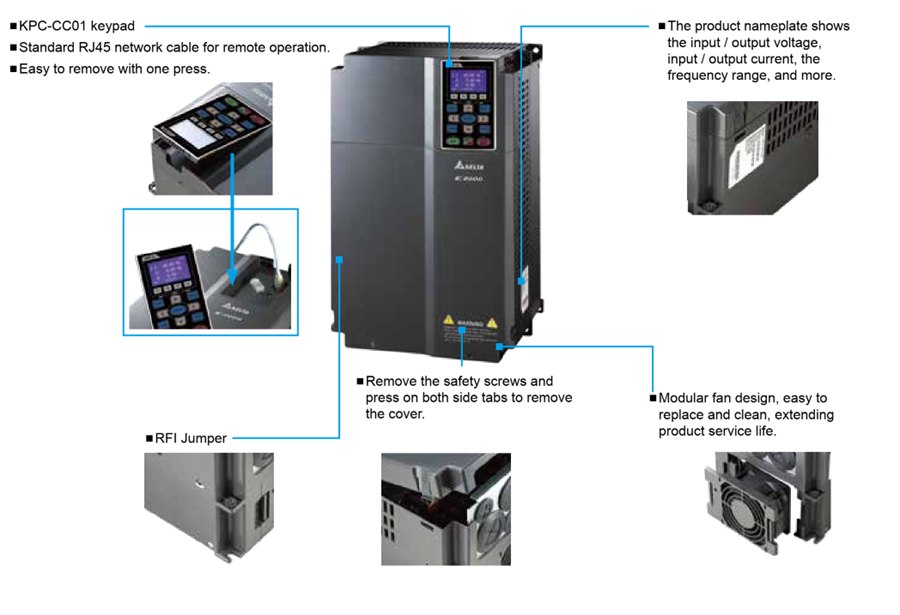 و سنکرون (PM) است؛ قابلیتهایی مانند: کنترل سرعت/گشتاور/موقعیت، PLC داخلی، شبکههای صنعتی (Modbus، CANopen Master/Slave، و کارتهای فیلدباس)، کیپد LCD با IP66. این مجموعه ویژگیها، سری C2000 را به گزینهای استاندارد برای خطوط تولید، HVAC، نوارنقاله، بالابر، چاپ، و کاربردهای سنگین تبدیل میکند.