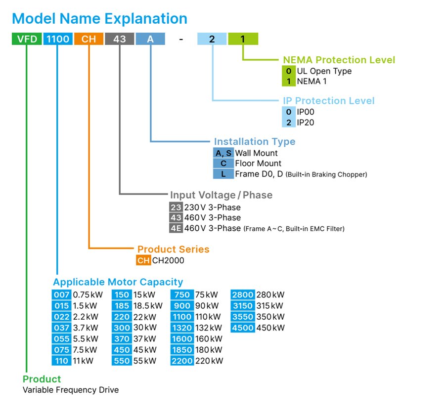 | C2000 | 0.75-630 | 0-599 | Normal Duty (ND) 120درصد جریان نامی به مدت 60ثانیه برای هر 5 دقیقه 160درصد جریان نامی به مدت3ثانیه برای هر30 ثانیه Heavy Duty (HD) 150درصد جریان نامی به مدت 60ثانیه برای هر 5 دقیقه 180درصد جریان نامی به مدت3ثانیه برای هر30 ثانیه | Modbus RTU روی RS485 EtherNet/IP and MODBUS TCP protocol | 230 V / 460 V model: V / FSVCVF+PGFOC+PGTQC+PG PM+PG FOC sensorless TQC sensorless V / F+PG SVC | 230V 460V 575V 690V |