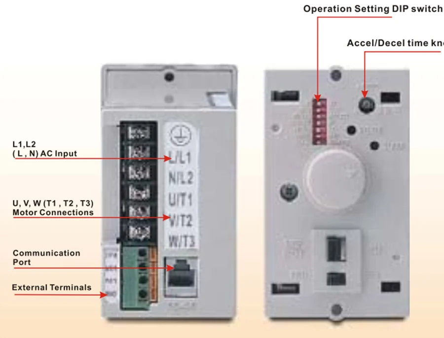 - پنل جلویی: پتانسیومتر فرکانس، ولوم Acc/Dec، LED سبز POWER و LED قرمز ALARM با الگوهای عیبیابی.