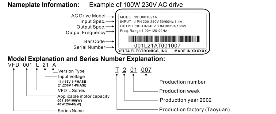 MODE: VFD001L21A → VFD (درایو فرکانس متغیر) - 001 (کد ظرفیت 60/100W)