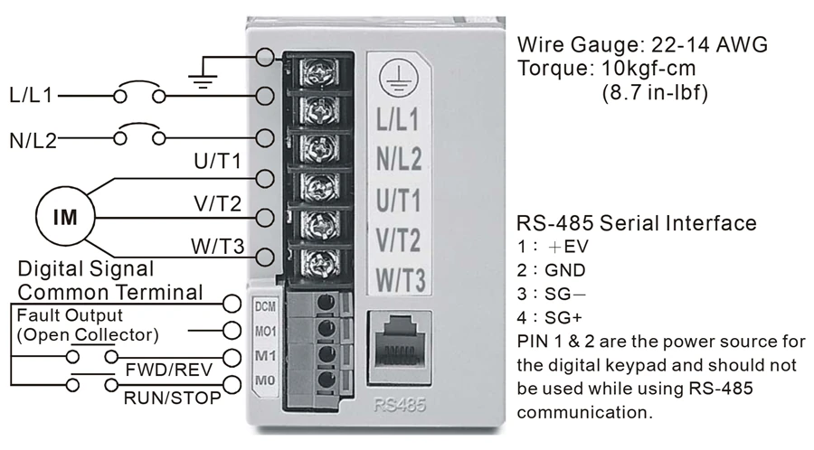 M0 (RUN/STOP)، M1 (FWD/REV)، MO1 (خروجی خطا Open-Collector)، DCM (مشترک دیجیتال)، و پورت RS-485. - نکته ایمنی RS-485: اتصال مودم/خط تلفن به پورت RS-485 ممنوع است (آسیب دائمی).