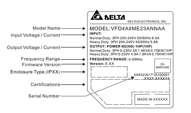 نمونه بالا یعنی: اینورتر DELTA ME300 با ورودی تکفاز ۲۳۰V، جریان نامی ۲٫۸A ﹙حدود ۰٫۴ kW﹚، با فیلتر EMC و با STO.