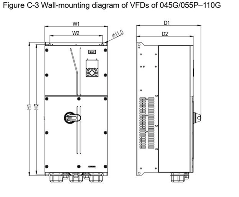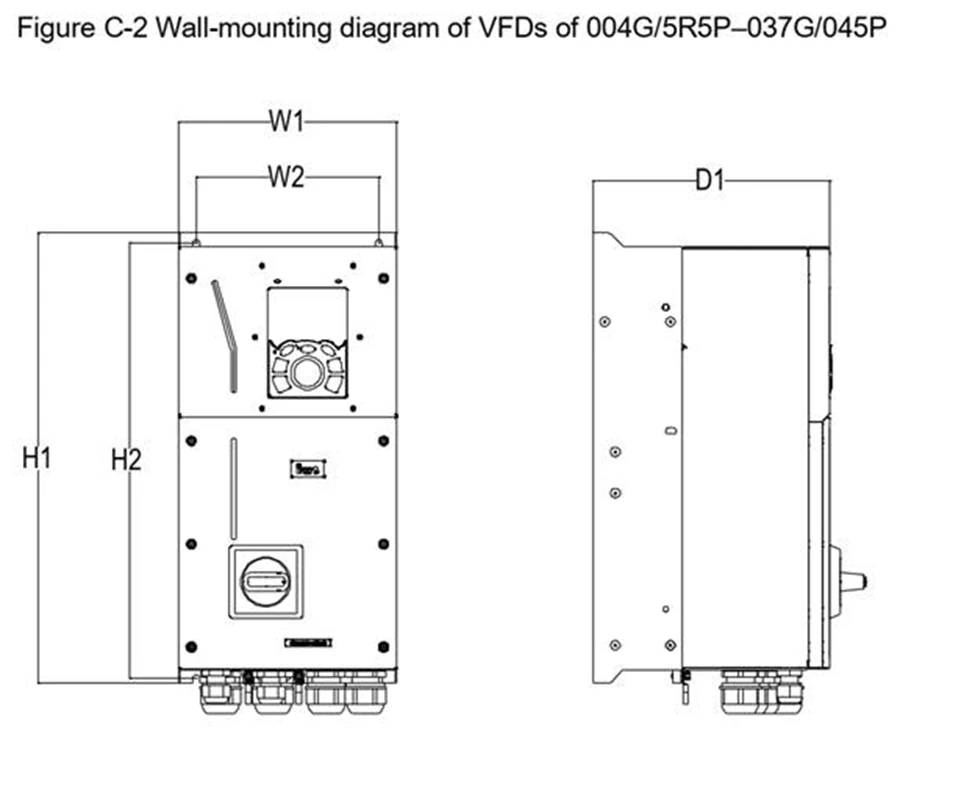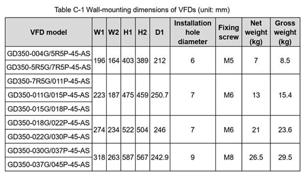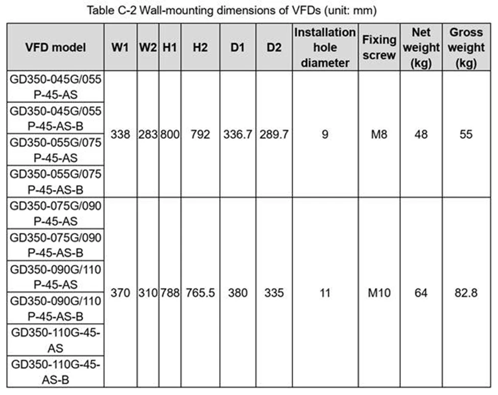 در این بخش ابعاد مختلف اینورتر هایgd350-ip55 و روش نصب دیواری آورده شده است؛ این سری در رنج توان های متفاوت ابعاد گوناگونی دارد برای مثال ابعاد اینورتر GD350-055G/075P-45-AS در جدول C2 ذکر شده است.