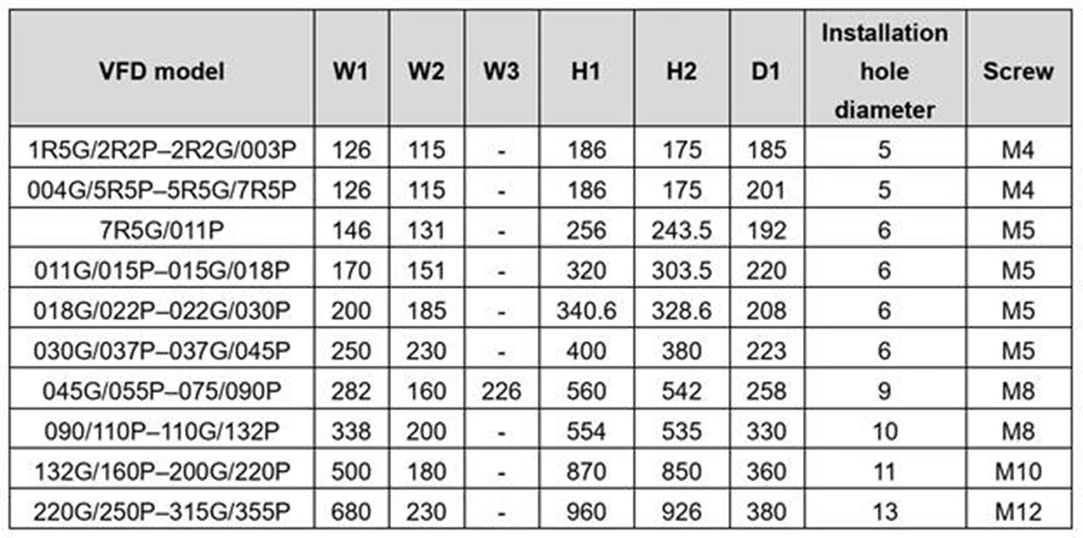 اینورترINVT GD350A در چند فریم و ابعاد مختلف عرضه میشود و اندازه دقیق آن به توان، کاربری G/P و روش نصب (دیواری/فلنجی/زمینی) وابسته است. قبل از جانمایی در تابلو، حتماً ابعاد بدنه و فاصلههای نصب را بررسی کنید تا تهویه و دسترسی سرویس بدون مشکل باشد.
