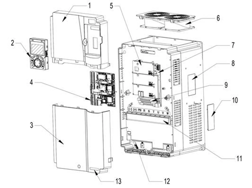 در این بخش، اجزای اصلی اینورتر اینوت GD350A را مطابق تصویر و نامگذاری استاندارد بررسی میکنیم تا دقیق بدانید هر قطعه چه نقشی در حفاظت، خنککاری، دسترسی به ترمینالها و توسعهپذیری درایو دارد.