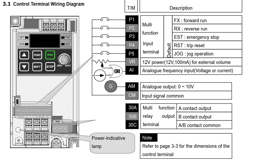 - آنالوگ ورودی/خروجی: AI=0-10V یا 0-20mA (انتخاب با کلید V/I)، AM=0-10V برای مانیتور فرکانس/جریان/ولتاژ/ولتاژ DC لینک. VR=+12V/100mA برای ولوم خارجی.