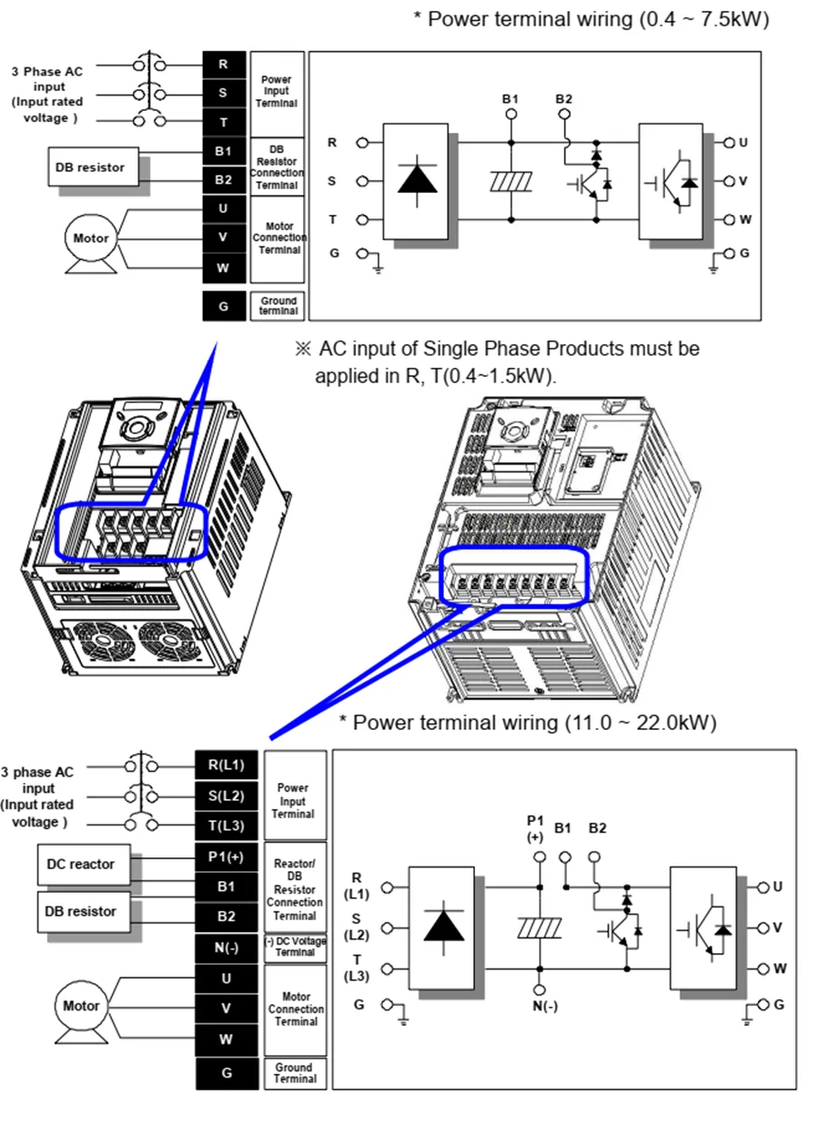 برای مدلهای بزرگ، محل ترمینال DC Reactor نیز مشخص شده است.