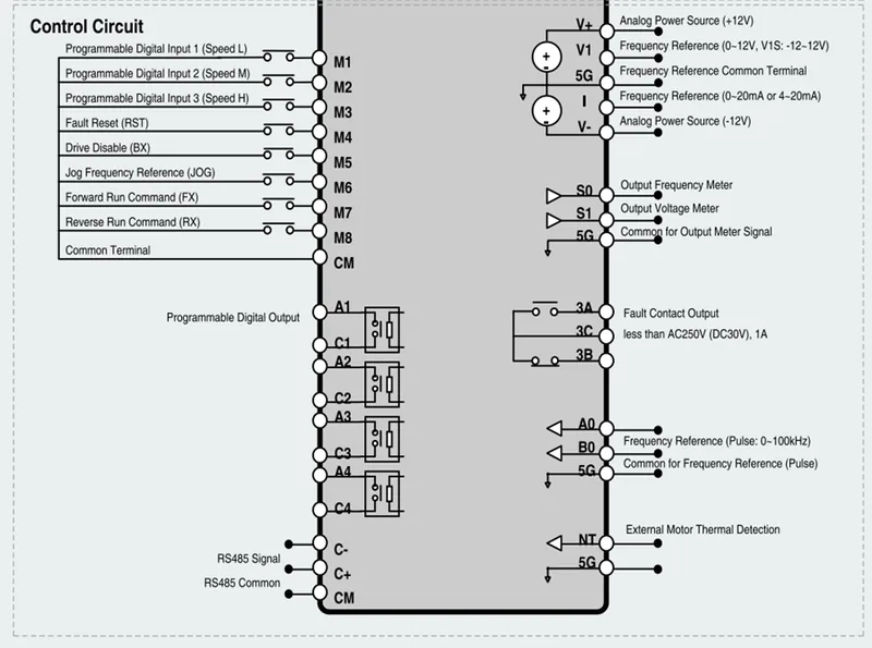- فرمانهای دیجیتال: ترمینالهای M1…M8 (شامل FX: فرمان جلو، RX: فرمان عقب، BX: Inverter Disable، RST/JOG و سرعتهای چندگانه) با انتخاب Sink/Source (NPN/PNP) از طریق جامپر J1.