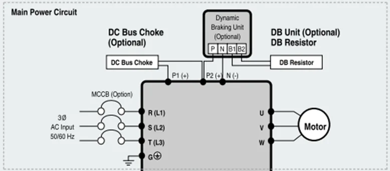 - ترمینالهای باس DC و ترمز: P(=P1/P2)/N، پایانههای B1/B2 برای واحد/مقاومت ترمز دینامیکی.