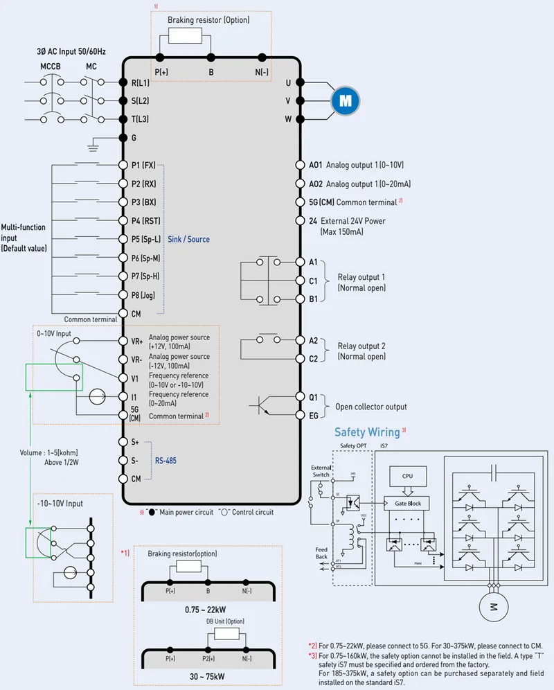 ترمز دینامیکی: پایانههای مرتبط با DB (مانند B1/B2) جهت اتصال مقاومت ترمز یا واحد ترمز خارجی.