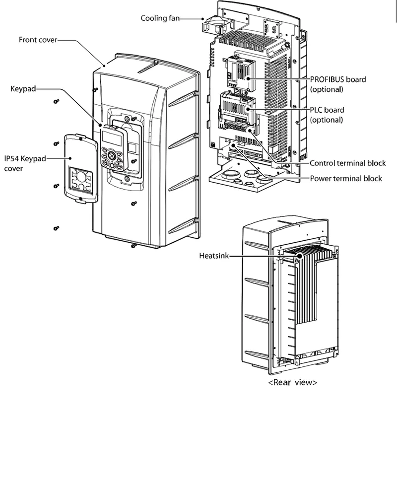 فیلتر EMC و راکتور DC (DCR): برای کاهش تداخل الکترومغناطیسی و هارمونیک شبکه بهکار میروند. برخی مدلها بهصورت داخلی دارای EMC و/یا DCR هستند که معمولاً با حروف F (برای EMC) و D (برای DCR) در کد مدل مشخص میشود.