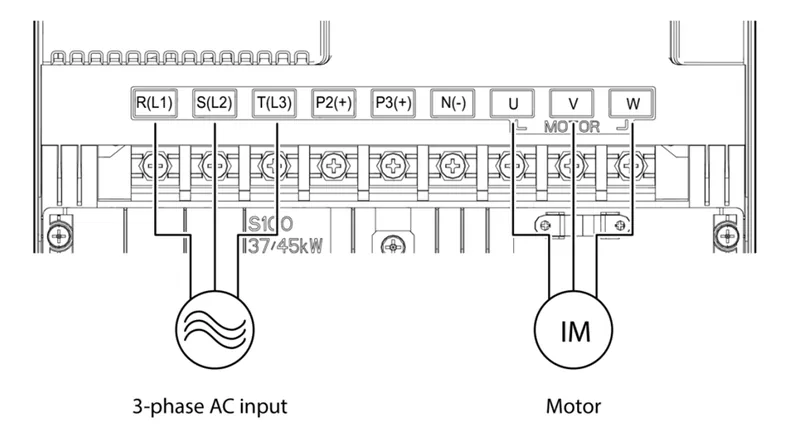 بهطور معمول پایانههای R(L1)/S(L2)/T(L3) برای ورودی، U/V/W برای خروجی، و پایانههای باس DC مانند P(+)/N(-) در همین ناحیه قرار دارند.