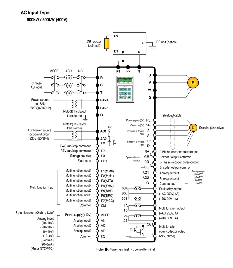 - برای مدلهای توان خیلی بالا (مثلاً ۵۰۰kW-4)، تغذیه AC 220V جداگانه برای فنها الزامی است (ترتیب پاور on/off مشخص).