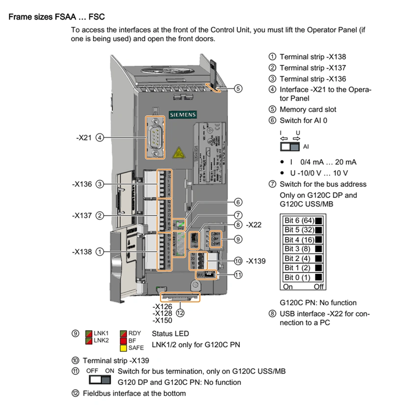 - ترمینالاستریپها (نمونه): -X130/132/133/134/136/137/138/139 (بسته به فریم)؛ سوئیچهای انتخاب AI و آدرس/ترمینیشن روی بدنهٔ درایو تعبیه شدهاند.