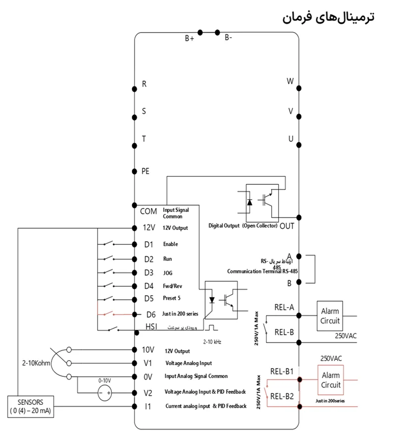 - D1..D5 (D6 در سری ۲۰۰): ورودی دیجیتال قابل برنامهریزی (۵ mA@24 V). نقشهای متداول: Enable، Start/Stop، Fwd/Rev، JOG، Preset Speeds.