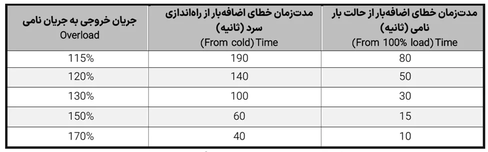 - OC/OL: محدودکننده جریان، Overcurrent≈۲× In؛ ETH (Electronic Thermal) با زمانسنجی و سطح هشدار/تریپ تنظیمی.