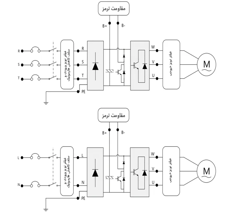 - B+ / B-: چاپر ترمز (اتصال مقاومت ترمز خارجی با محدوده اهم/توان مشخص طبق جدول مدلها)