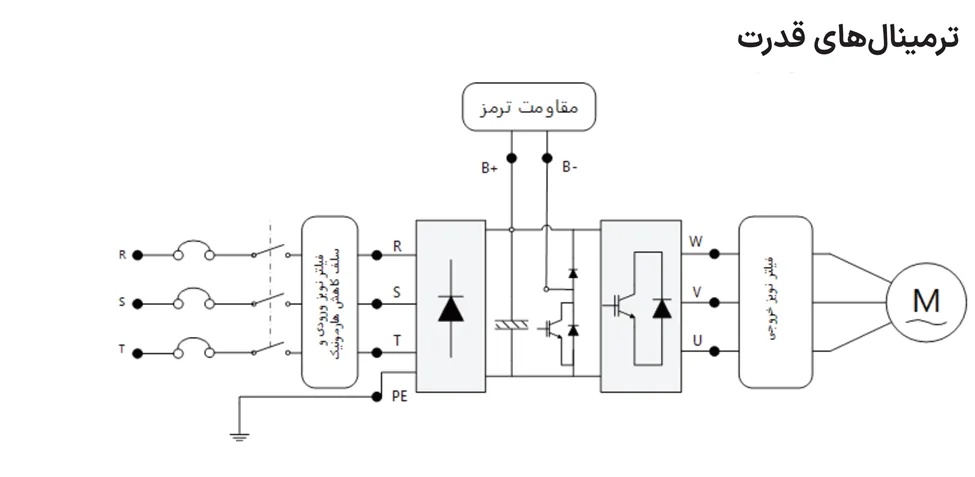 - ترمز دینامیکی/چاپر: B+ , B− (اتصال مقاومت ترمز تنها به این ترمینالها مجاز است)