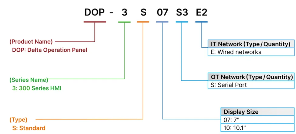 کدنامگذاری DOP-3SxxS3E2 به سادگی نوع شبکه OT/IT، اندازه نمایشگر و رده استاندارد را مشخص میکند؛ S=Standard، S3=پورتهای سریال، E=شبکه سیمی IT. مدلهای رایج فعلی: