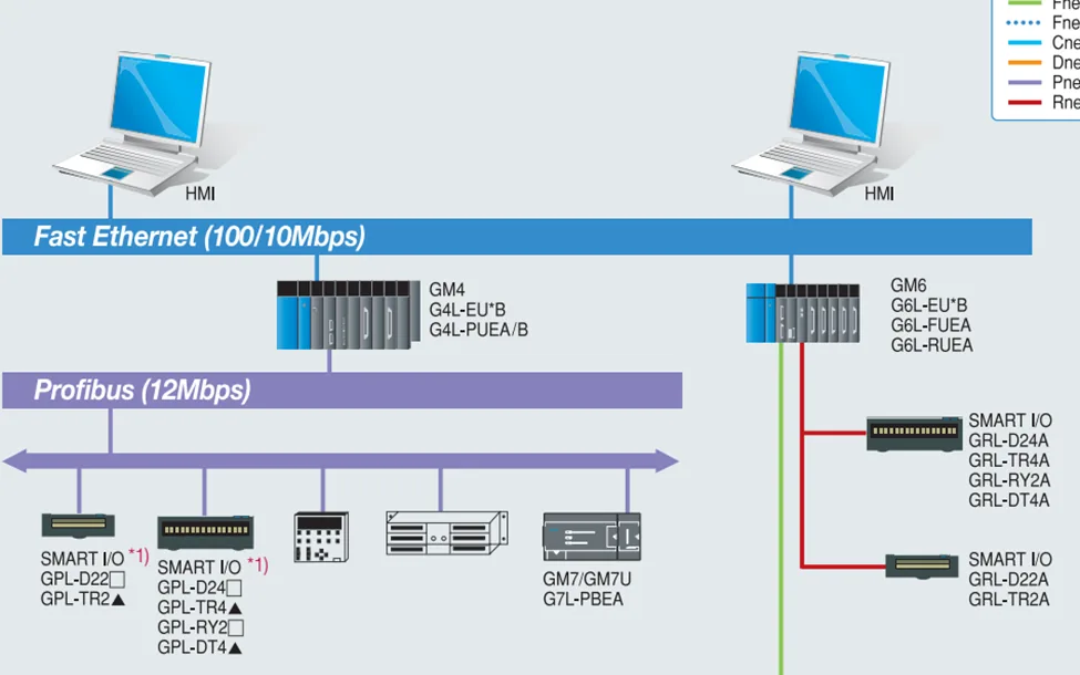 - GM4 (Modular با ظرفیت بالا): ماژولهای CPU A/B/C با I/O محلی زیاد و توسعه Remote I/O بسیار بزرگ؛ شبکههای Fast Enet/Fnet/Rnet/DeviceNet/Profibus-DP.