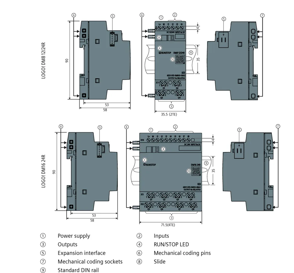 - LOGO- Expansion Modules: دیجیتال DM8/DM16 (4DI/4DO یا 8DI/8DO؛ رله یا ترانزیستوری)، آنالوگ AM2 (2AI 0–10V یا 0/4–20mA)، AM2 RTD (2×PT100/1000)، AM2 AQ (2AO 0–10V یا 0/4–20mA).
