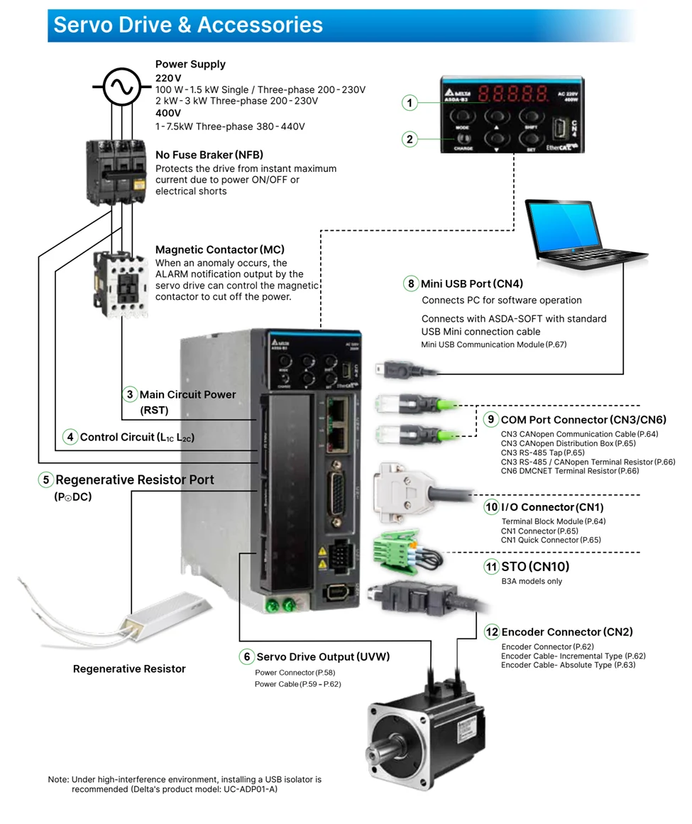 - پورتها: CN3/CN6 برای Modbus/CANopen/DMCNET/EtherCAT، Mini-USB برای ASDA-Soft، CN1 I/O عمومی، CN2 انکودر، CN10 STO در مدلهای B3A.