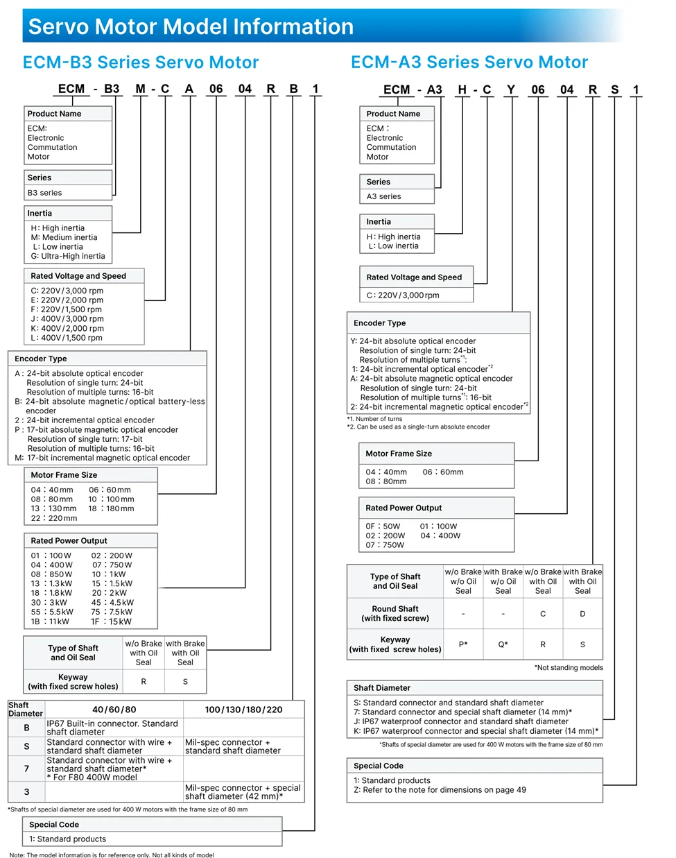 - 200–230VAC: 100W، 200W، 400W، 750W، 1kW، 1.5kW، 2kW، 3kW؛ دور نامی 3000rpm و دور بیشینه 6000rpm (در برخی فریمها تا 6700rpm). نمونه: ECM-B3M-C20604 با 400W، 3000/6000rpm.
