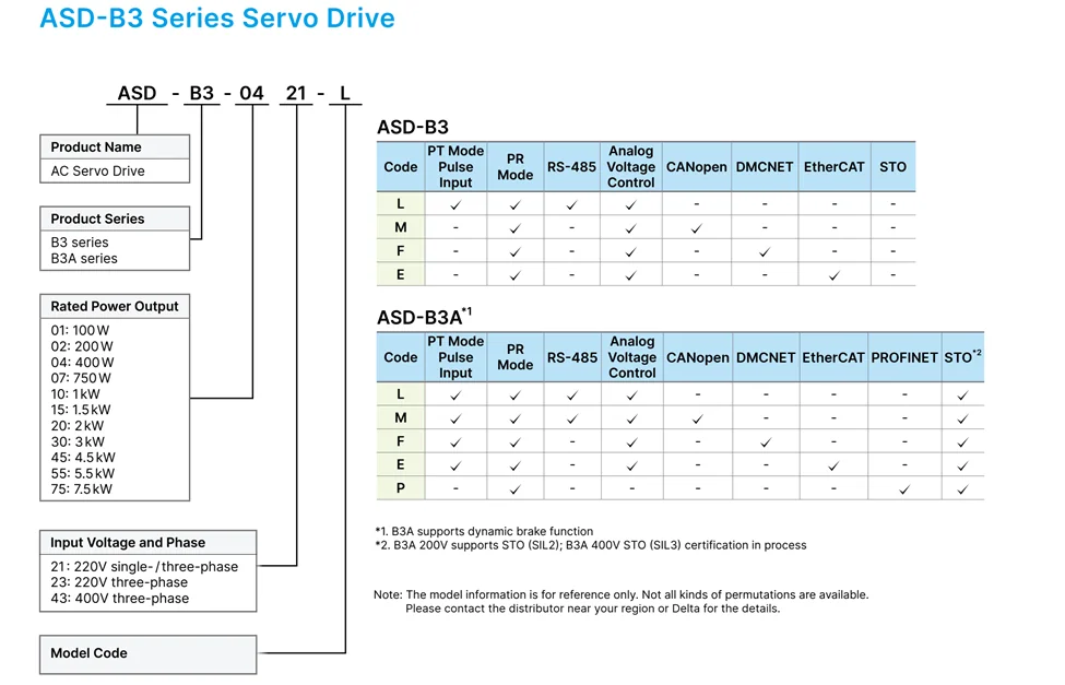 **B3-E** برای **EtherCAT**، و **B3A-P** برای **PROFINET** با سیکل **1 ms** عرضه میشود؛ **STO (SIL2)** در مدلهای **B3A** قابلدسترس است.