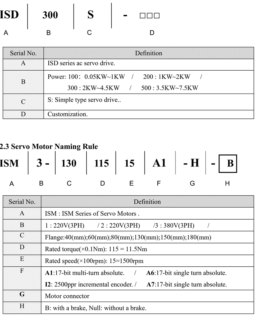 سروو موتور هایتک ISD300S با موتورهای سری ISM (فِلنج 40–180mm، گشتاور نامی برحسب کد) جفت میشود. کدگذاری ISM نشان میدهد ولتاژ 3-فاز 380V، فِلنج (mm)، گشتاور نامی ×0.1Nm و سرعت نامی ×100rpm است؛ مثال «…115-15…» یعنی 11.5Nm در 1500rpm. توان از رابطه P=0.1047×N×T محاسبه میشود.