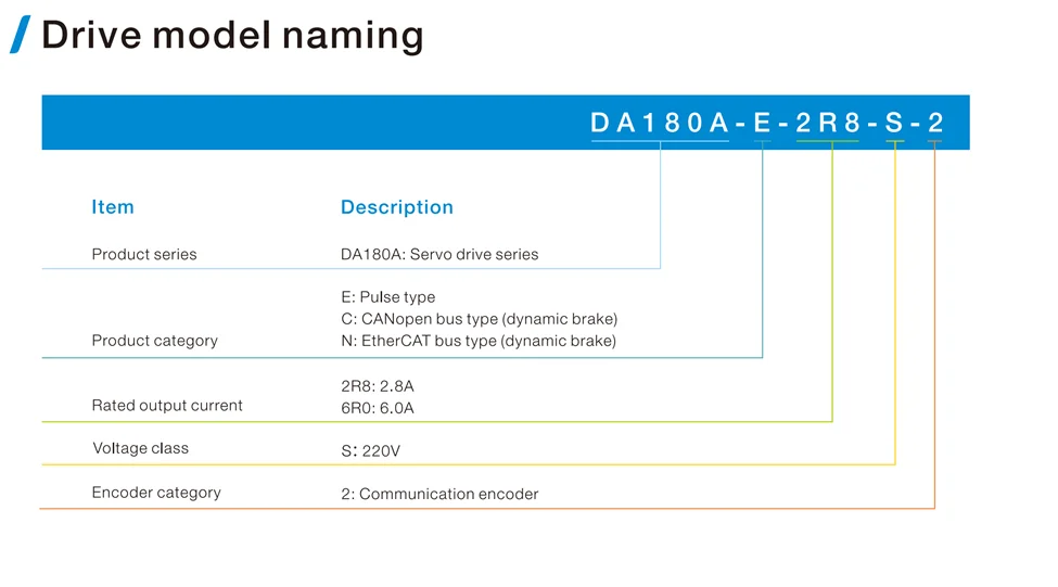 **DA200/DA200A** در ردهی **High-performance** با قابلیتهای پیشرفتهی همگامسازی محورها، گنتری، STO و شبکههای صنعتی کامل طراحی شدهاند. **DA180A** یک گزینهی **Basic-Class** برای کاربردهای عمومی اتوماسیون است؛ نصب سادهتر و هزینهی رقابتیتری دارد.