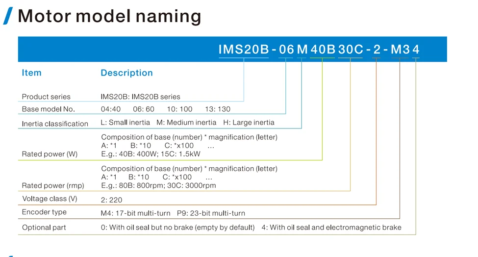 قاعده تطبیق: انتخاب براساس توان نامی، ولتاژ، نوع انکودر و اینرسی بار انجام میشود. سری IMS20B بازه 0.05–75kW و سایز فریم 40–263mm را پوشش میدهد (Small/Medium Power). برای 0.05–7.5kW از Small Power و برای 6.3–74kW از Medium Power استفاده کنید.