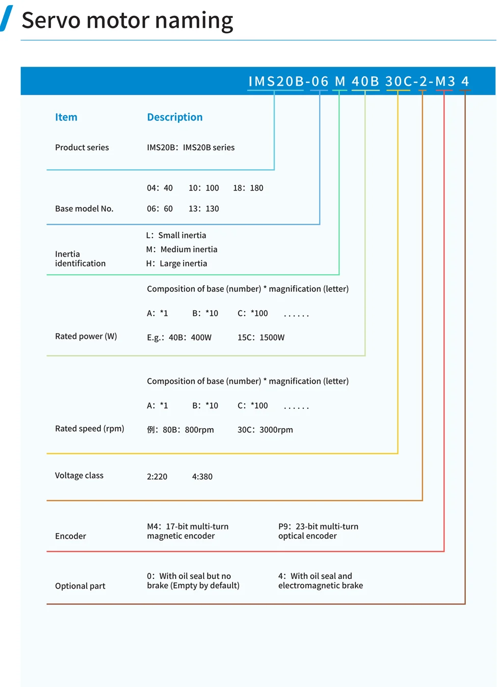 | 220V | 0.4kW | IMS20B-04L05B30C-2-M41/P9 | 50W@3000rpm | قاب 40، انکودر 17/23-bit، نسبتهای طولی کوتاه. | 2R8-S-2 (A) |