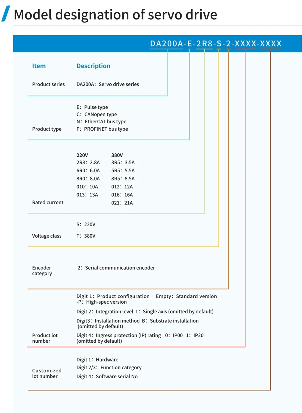 - کُدینگ مدل درایو: نمونه «DA200A-E-2R8-S-2-…» که نوع ورودی پالس/باس، جریان نامی، کلاس ولتاژ (S:220V / T:380V) و سطح مشخصات را نشان میدهد.