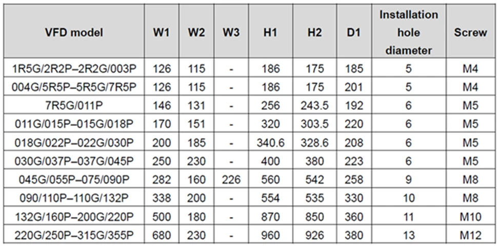 بنابراین طبق جدول فوق ابعاد اینورتر اینورتر سه فاز 1.5 کیلووات INVT سری GD350A برابر با (عمق) 185 x (ارتفاع) 186 x (عرض)126 میلیمتر می باشد.