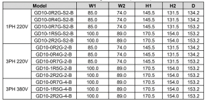 بنابراین طبق جدول فوق ابعاد اینورتر سه فاز 4 کیلووات سری GD20 اینوت GD20-004G-4 برابر با (عمق) 167 x (ارتفاع) 256 x (عرض) 146 میلی متر می باشد.
