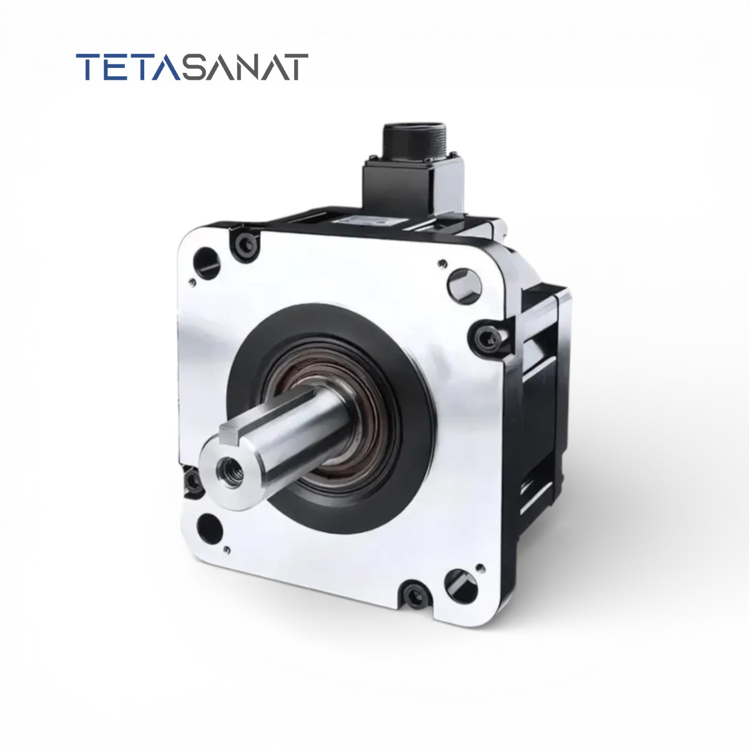 در این مدل، توان نامی در رنج 0.75kW در نظر گرفته شده است. این سطح توان برای محورهای سبک تا متوسط مناسب است و به طراح محور اجازه میدهد بین گشتاور در دسترس، سرعت حرکت و اندازه فریم موتور تعادل برقرار کند. گشتاور نامی موتور در حدود 2/4N.m است؛ این مقدار تعیین میکند موتور در کارکرد پیوسته و بدون اضافهبار تا چه حد میتواند بار را بدون افت سرعت حمل کند و در عین حال حاشیهای برای شتابگیری و ترمزگیری محور باقی بگذارد. سرعت پایه موتور معمولاً در محدوده 3000rpm تعریف میشود. این سرعت، پایه طراحی نسبت گیربکس و مکانیزم انتقال حرکت است و تعیین میکند در نهایت به چه سرعت خطی یا زاویهای روی بار دست پیدا میکنید. فیدبک موقعیت در این سری بر اساس انکودر 22bit پیادهسازی شده است. هرچه تفکیکپذیری انکودر بالاتر باشد، سروو درایو میتواند سرعت و موقعیت را با جزئیات بیشتری ببیند و نتیجهاش حرکت نرمتر، دقت بهتر در توقف و کاهش خطای ردیابی در سیکلهای تکراری است. در این مدل، موتور بدون ترمز عرضه میشود. این موضوع برای محورهای افقی یا مکانیزمهایی که پس از قطع فرمان نیازی به قفلشدن مکانیکی ندارند کاملاً مناسب است و در عوض این مزیت را دارد که اینرسی و پیچیدگی مکانیکی مجموعه کمتر میشود.