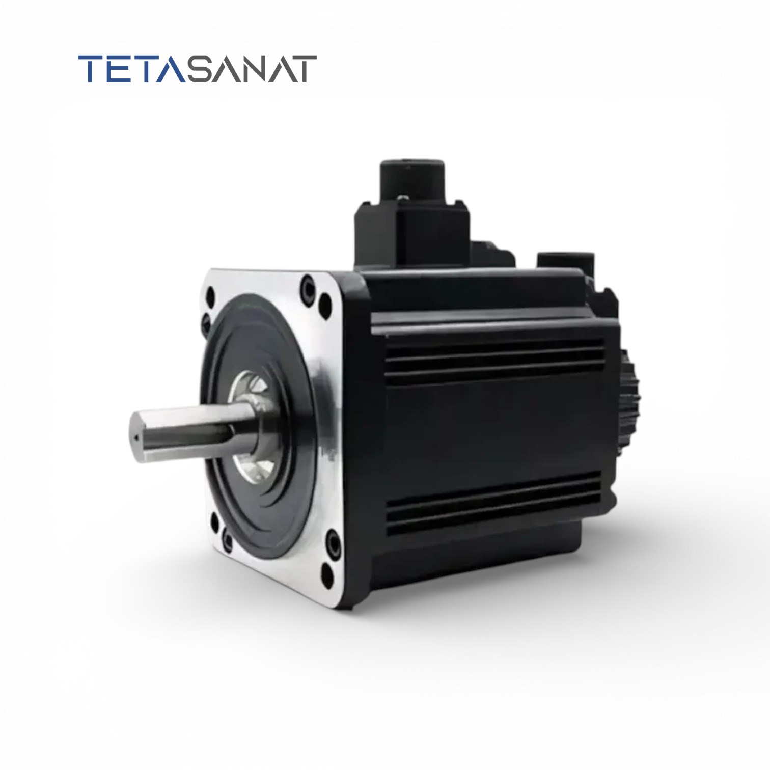 در این مدل، توان نامی در رنج 1kW در نظر گرفته شده است. این سطح توان برای محورهای سبک تا متوسط مناسب است و به طراح محور اجازه میدهد بین گشتاور در دسترس، سرعت حرکت و اندازه فریم موتور تعادل برقرار کند. گشتاور نامی موتور در حدود 4/77N.m است؛ این مقدار تعیین میکند موتور در کارکرد پیوسته و بدون اضافهبار تا چه حد میتواند بار را بدون افت سرعت حمل کند و در عین حال حاشیهای برای شتابگیری و ترمزگیری محور باقی بگذارد. سرعت پایه موتور معمولاً در محدوده 2000rpm تعریف میشود. این سرعت، پایه طراحی نسبت گیربکس و مکانیزم انتقال حرکت است و تعیین میکند در نهایت به چه سرعت خطی یا زاویهای روی بار دست پیدا میکنید. فیدبک موقعیت در این سری بر اساس انکودر 22bit پیادهسازی شده است. هرچه تفکیکپذیری انکودر بالاتر باشد، سروو درایو میتواند سرعت و موقعیت را با جزئیات بیشتری ببیند و نتیجهاش حرکت نرمتر، دقت بهتر در توقف و کاهش خطای ردیابی در سیکلهای تکراری است. در این مدل، موتور بدون ترمز عرضه میشود. این موضوع برای محورهای افقی یا مکانیزمهایی که پس از قطع فرمان نیازی به قفلشدن مکانیکی ندارند کاملاً مناسب است و در عوض این مزیت را دارد که اینرسی و پیچیدگی مکانیکی مجموعه کمتر میشود.