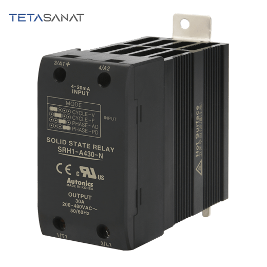 رله حالت جامد یا SSR یک سوئیچینگ الکتریکی است که در آن از قطعات نیمه هادی به کاربرده شده، در نتیجه هنگام قطع و وصل هیچ صدایی ندارد. از مزایای رله حالت جامد نسبت به رله های مکانیکی میتوان به سرعت قطع و وصل بالا و طول عمر زیادشان اشاره کرد. رله حالت جامد (SSR) آتونیکس SRH1-A430-N دارای ورودی 4 تا 20 میلی آمپر analog است. ولتاژخروجی این SSR آتونیکس به صورت 200 تا 480 ولت AC و جریان خروجی آن 30 آمپر می باشد. ابعاد این SSR تک فاز 45X100 میلی متر است. جهت خرید SSR Autonics و اطلاع از لیست قیمت رله حالت جامد Autonics، با واحد فروش شرکت تتا صنعت نمایندگی فروش SSR آتونیکس تماس بگیرید.